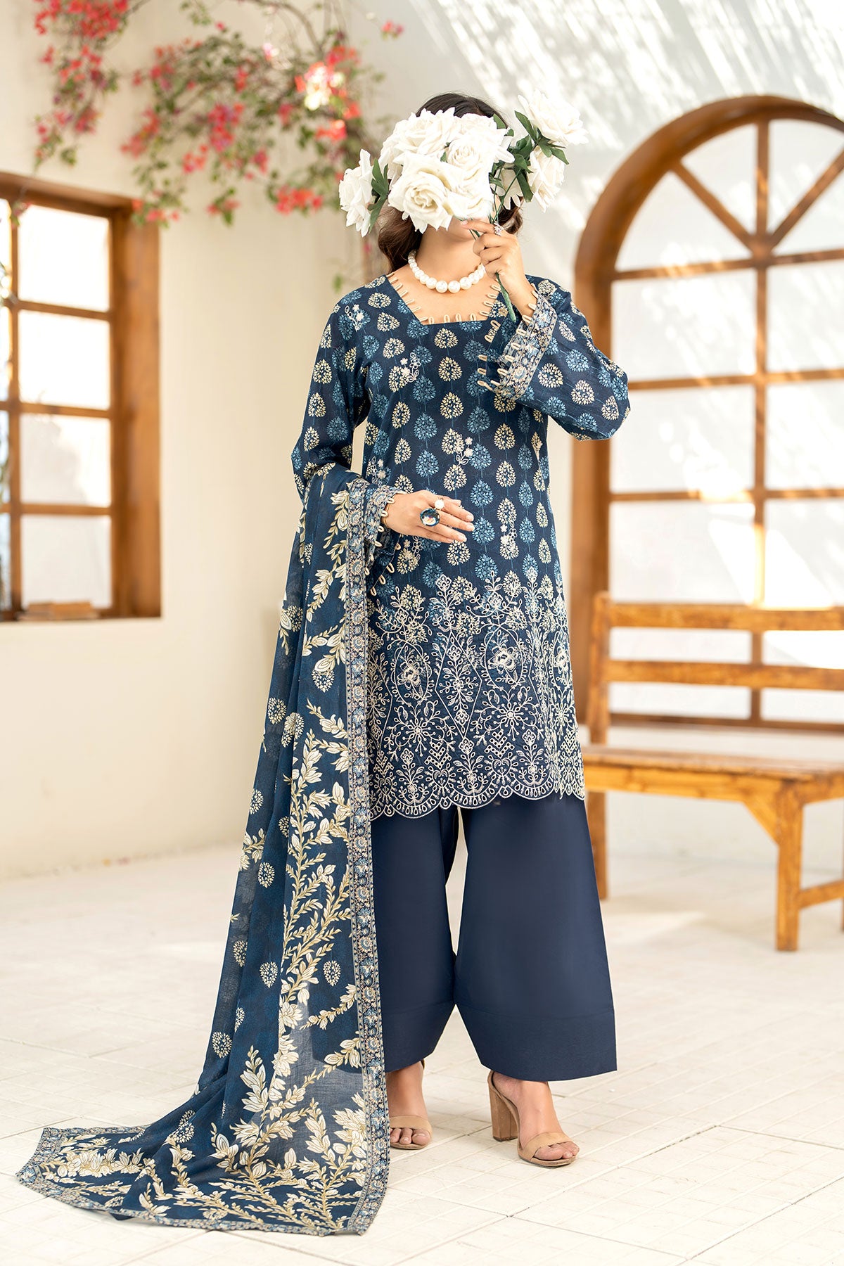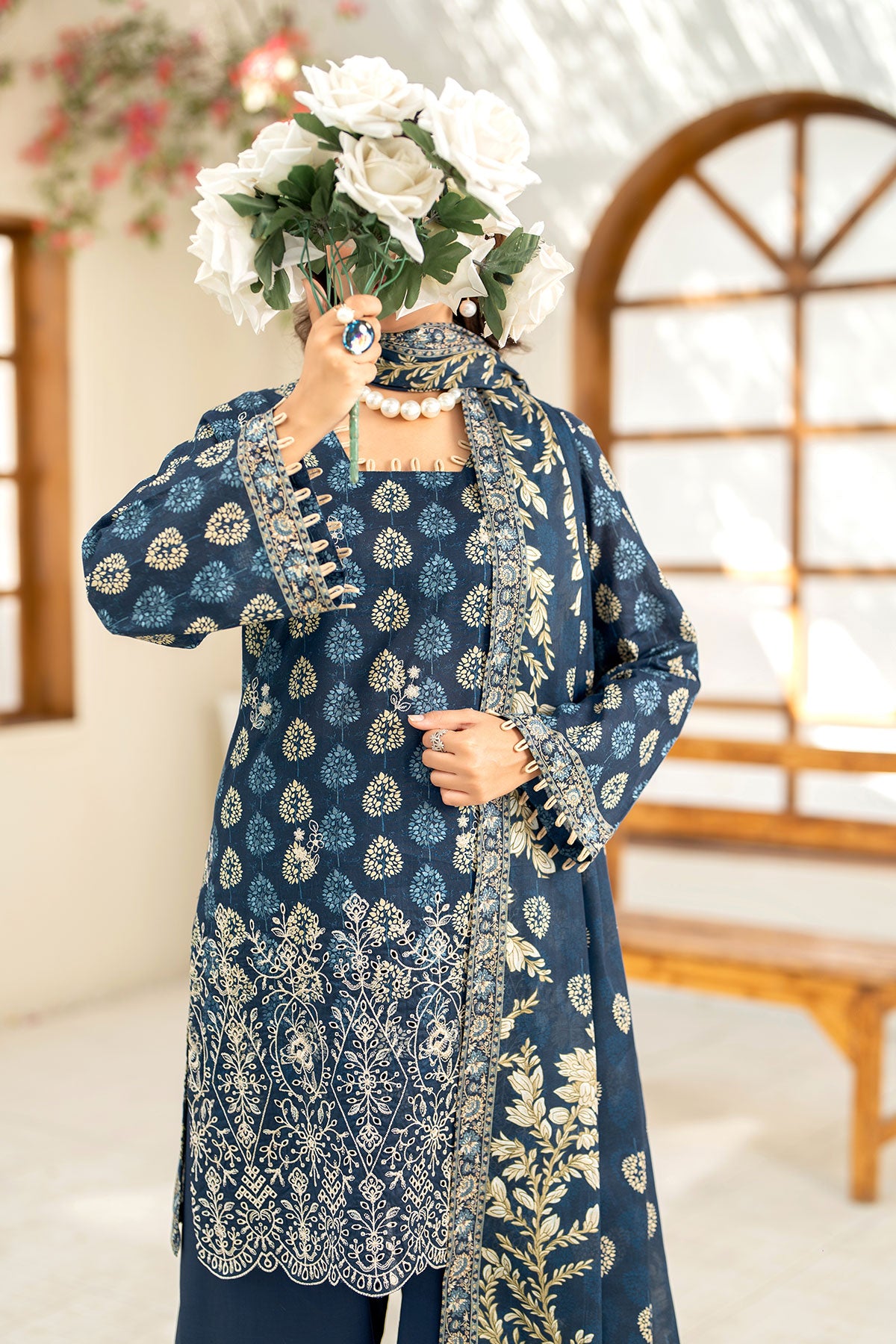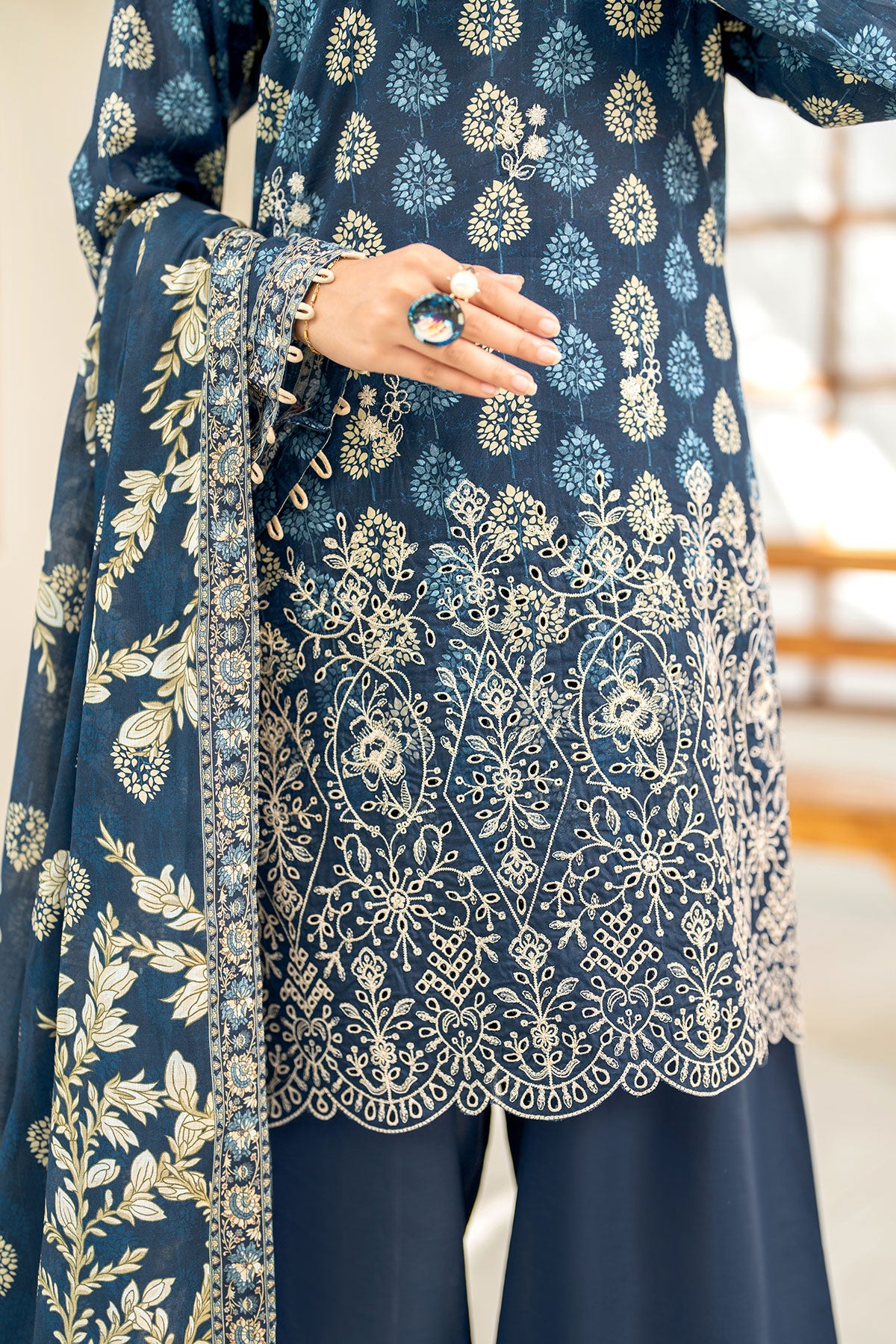 Adorn yourself in this blue and beige toned three-piece unstitched printkari lawn ensemble, featuring an embroidered lawn shirt, printed lawn dupatta and cotton trouser.