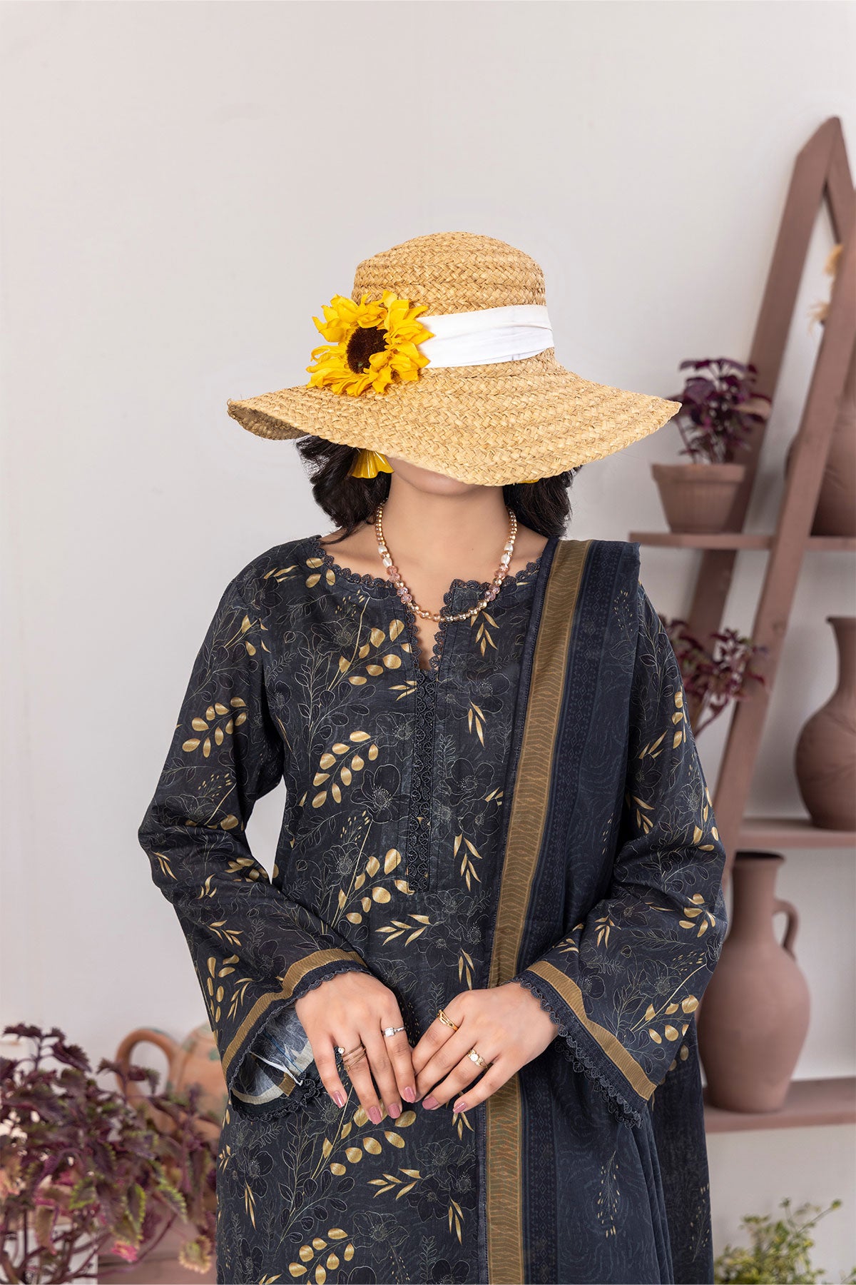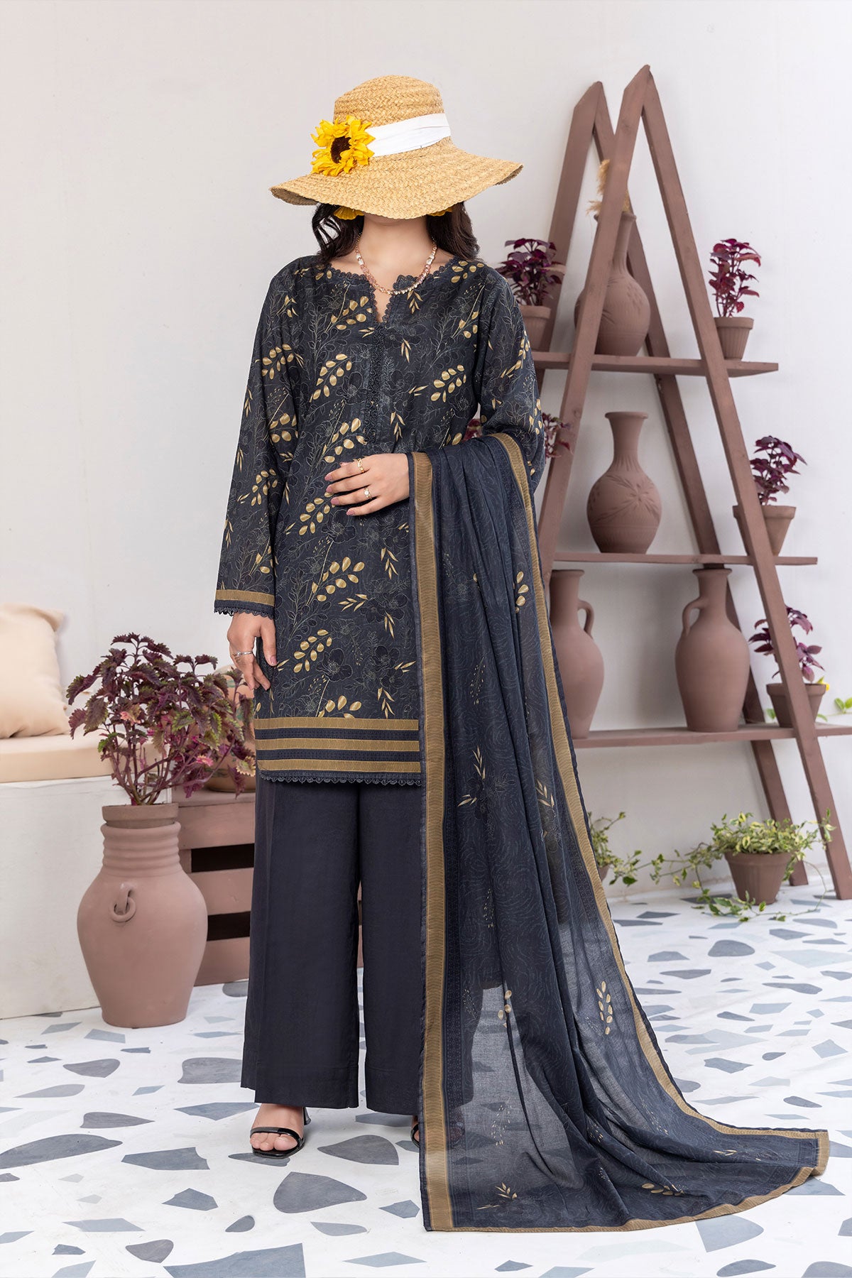 Express your unique style with this stunning black and gold three-piece fancy printed lawn ensemble.