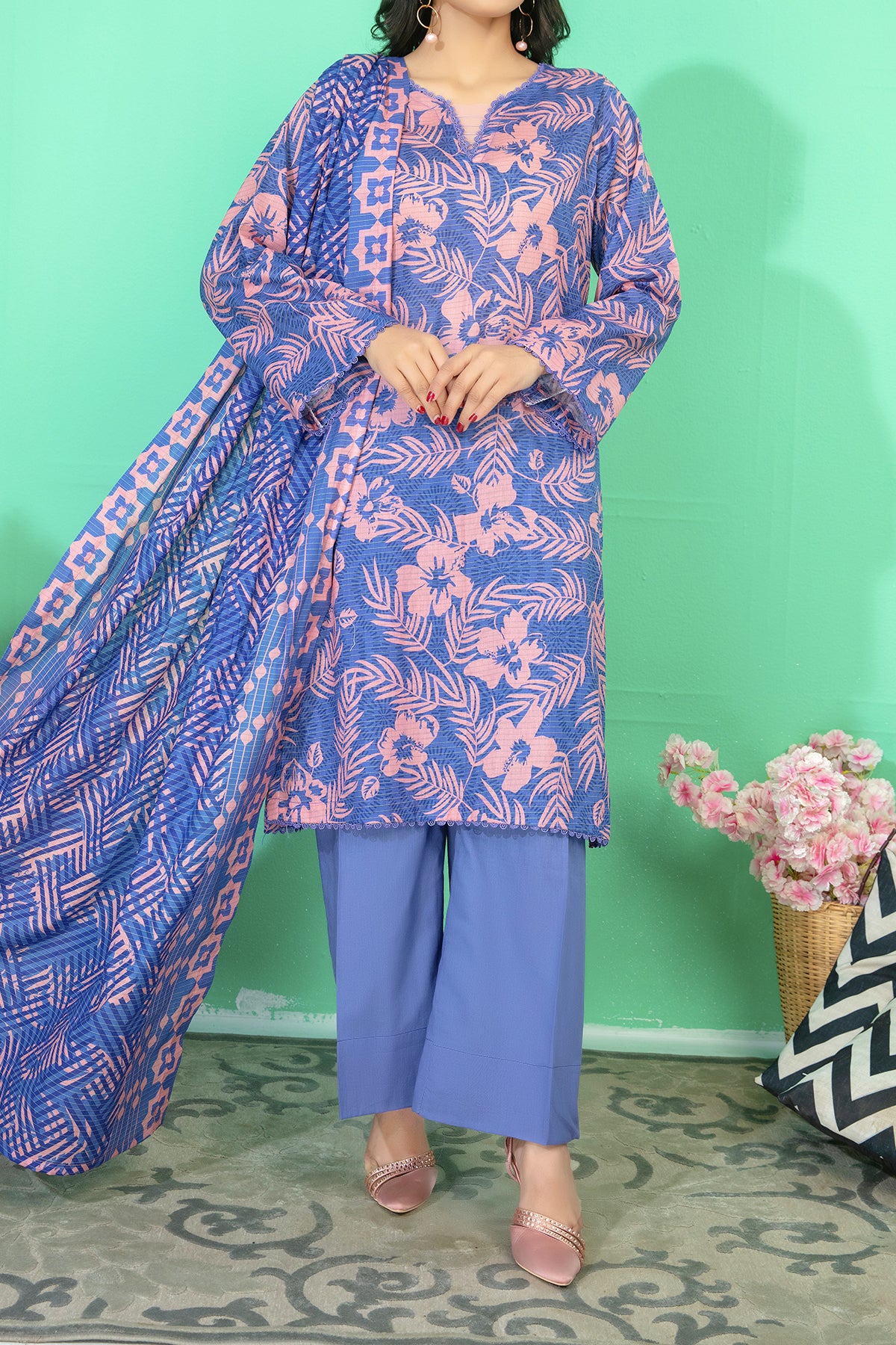 Express your unique style with this stunning blue and pink three-piece lawn ensemble.